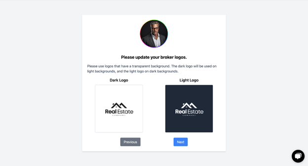 Hover over the default images below and upload your brokerage logo. For the website we’re creating for you to look its best, you will need a dark logo and a light one. Both should be on transparent backgrounds. Click on “Next.”