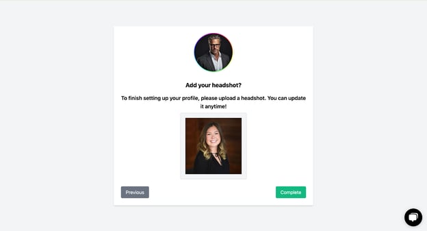 Last step! Upload your professional headshot. For best results, this image should be at least [image size]. Click on “Complete.”